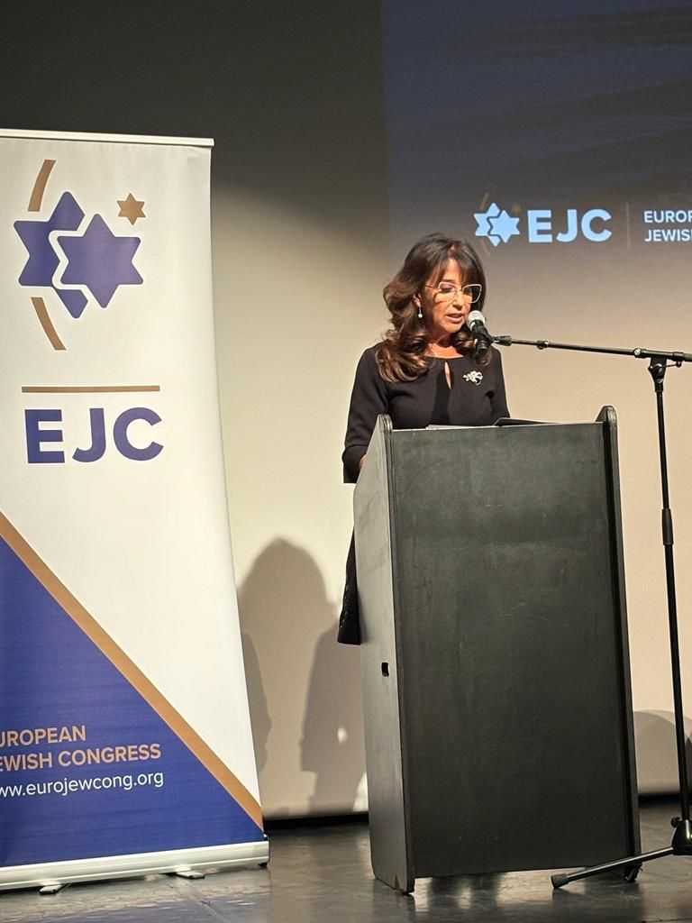 EJC Executive Vice-President Raya Kalenova welcomed the guests and said, “This year the commemoration is different. For three generations already, European Jews, whatever age they are, have the Shoah ingrained in their minds and hearts. The generation of my parents grew up mostly being orphans; my generation grew up without grandparents. This pain is still present in our young generations. Since October 7th, everything has changed for Jewish communities across the world. Hamas’s brutal massacre, the most devastating attack against the Jewish people since the Holocaust, has darkened our lives and broken our hearts. The condemnation of the worst pogrom of the 21st century is not being loud enough, giving the impression that there exists an attempt to erase this massacre from our collective memory. We cannot let this happen!”